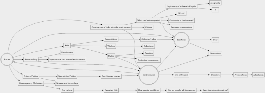 • What stories are told to understand the weather: how do historical myths relate to contemporary ones, e.g. sci-fi movies about ecological disasters, where stories are only told when the weather becomes extreme… what happens to all the other stories about weather in daily life?